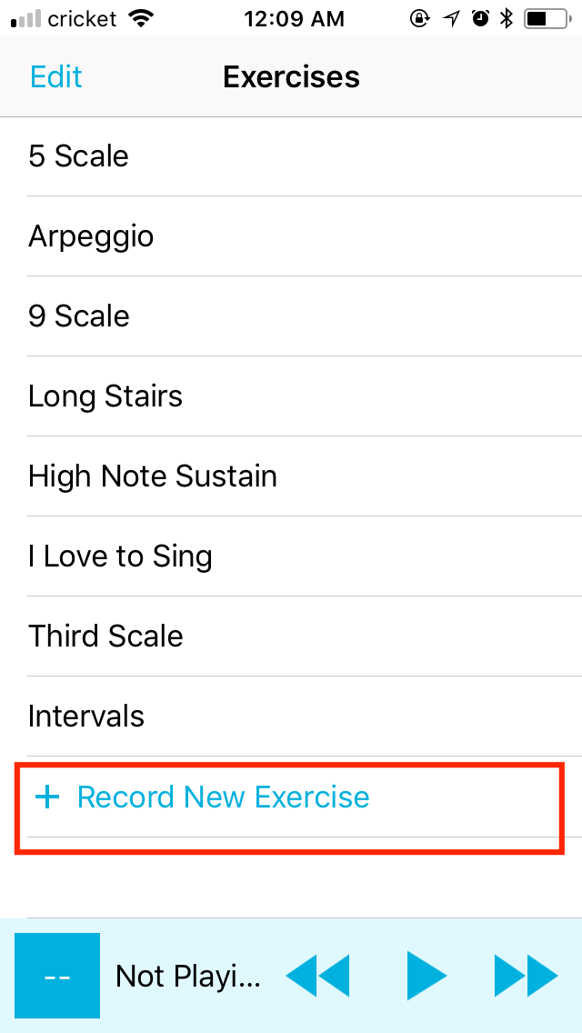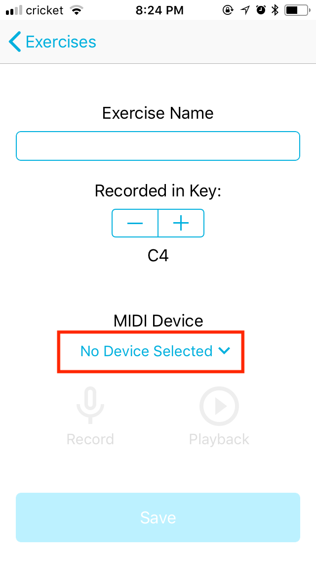 Once your keyboard is connected, tap "Record New Exercise" from the exercise list. Select your device from the MIDI device list, and start recording.